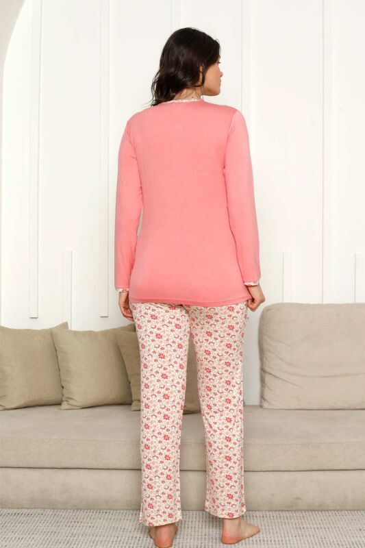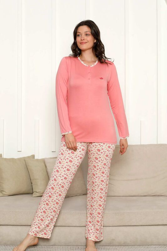 Bayan Pijama Takımı - Somon Çiçek Desen Uzun Kol Likralı Viskon