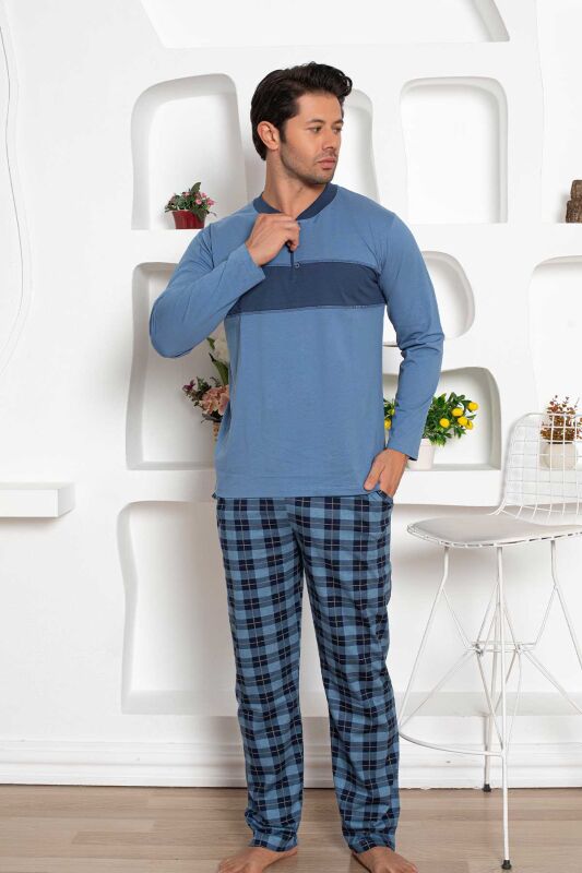 Ekoseli Erkek Pijama Takımı - İndigo Uzun Kollu Penye