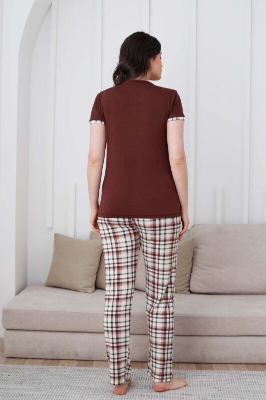 Ekoseli Kadın Pijama Takımı - Kahverengi Nakışlı Likralı Kısa Kollu