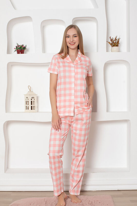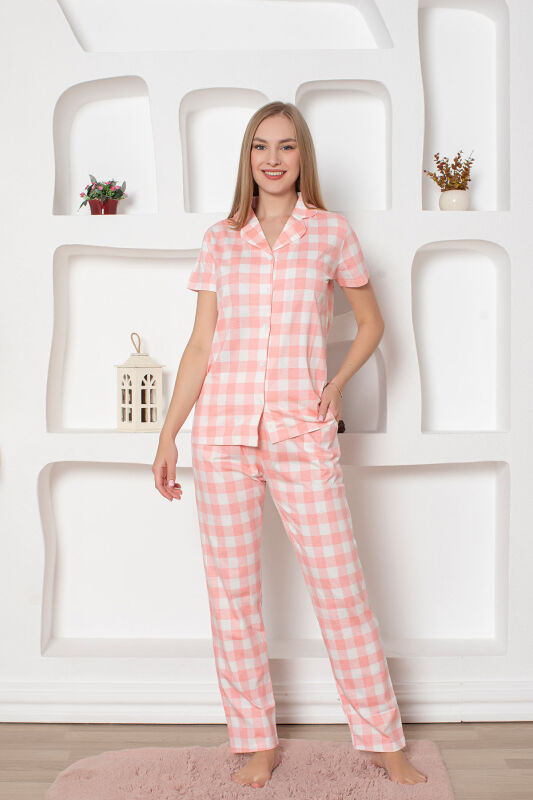 Ekoseli Önden Düğmeli Kadın Pijama Takımı - Pembe Kısa Kollu Penye