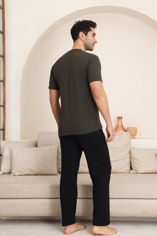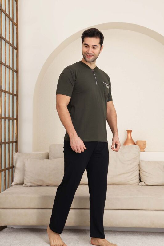 Erkek Pijama Takımı - Haki Arma Nakışlı Likralı Kısa Kollu Penye