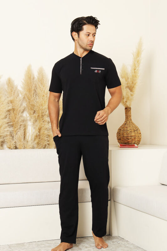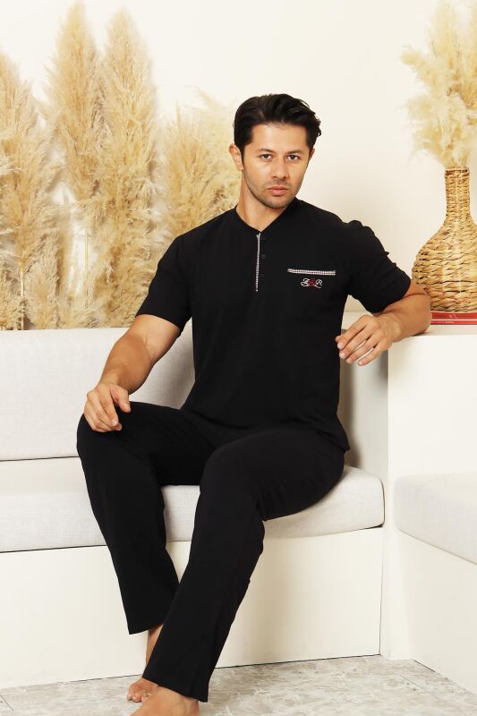 Erkek Pijama Takımı - Siyah Arma Nakışlı Likralı Kısa Kollu Penye