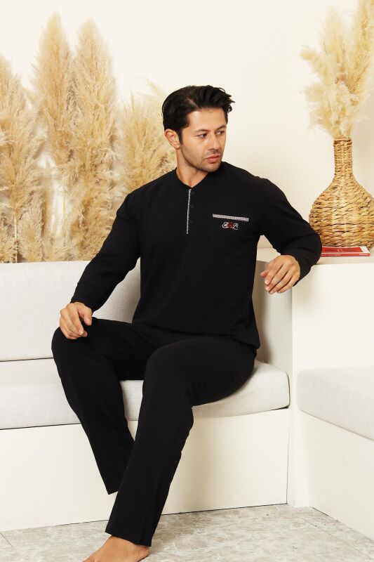 Erkek Pijama Takımı - Siyah Arma Nakışlı Likralı Uzun Kollu Penye